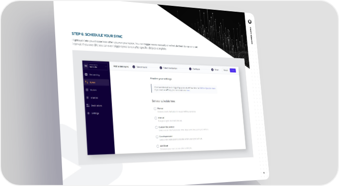 8 STEP 6: SCHEDULE YOUR SYNC Hightouch lets you choose how often you run your syncs. You can trigger syncs manually or schedule them to run on a set interval. If you use dbt, you can even trigger syncs to run after specific dbt jobs complete. CHAMPION GUIDES