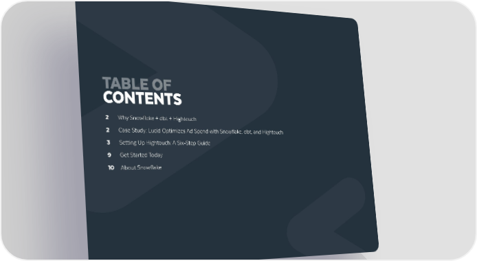 2 Why Snowflake + dbt + Hightouch 2 Case Study: Lucid Optimizes Ad Spend with Snowflake, dbt, and Hightouch 3 Setting Up Hightouch: A Six-Step Guide 9 Get Started Today 10 About Snowflake