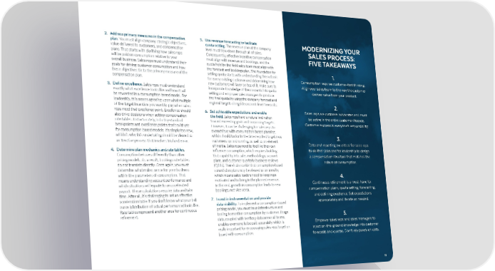 11 CHAMPION GUIDES 2. Address primary measures in the compensation plan . You must align company strategic objectives, value delivered to customers, and compensation plans. That starts with clarifying how sales reps will be paid on consumption relative to your overall business. Sales reps must understand their goals for driving customer consumption and how these objectives tie to the primary measure of the compensation plan. 3. Define excellence. Sales reps must understand exactly what excellence looks like and how it will be rewarded in a consumption-based model. For leadership, this means agreeing upon what multiple of the target incentive you want to pay when sales reps meet that excellence point. Excellence should also drive decisions when setting compensation rate tables. Unfortunately, industry-standard breakpoints and excellence points don’t exist yet for consumption-based models. It’s simply too new, which is why this undertaking should be viewed as an iterative process that involves trial and error. 4. Determine plan mechanics and rate tables. Consumption behaves differently than other pricing models. As a result, bookings rate tables do not translate directly. Once again, you must determine what makes sense for your business within the parameters of consumption. That means understanding account performance and which situations will equate to an accelerated payout. These calculations require data and take time. After all, it’s challenging to set an effective acceleration table if you don’t know what your bell curve (distribution of actual performance) looks like. Rate tables represent another area for continuous refinement. 5. Use revenue forecasting to facilitate quota setting. The revenue plan at the company level must flow down through all of sales. Consequently, effective incentive compensation must align with revenue and bookings, and the quota held by the field sales team must align with the forecast and bookings plan. The foundation for setting quota starts with understanding the outlook for every existing customer and determining how new customers will layer on top of it. Make sure to incorporate knowledge of the accounts into quota setting and empower sales managers to produce the final quota by using the company forecast and regional targets alongside account-level forecasts. 6. Set achievable expectations and enable the field. Sales reps have a natural inclination toward exceeding goals and surpassing targets. However, it can be challenging for sales reps to overachieve with consumption-based planning, which should factor in the time required to get new customers up and running, as well as an element of inertia. Sales reps need to feel like they can influence consumption, which requires building that capability into sales methodology, account plans, and customer quarterly business reviews (QBRs). There’s also a risk that consumption-based commission plans may be viewed as an annuity, which means sales leaders need to keep reps motivated and to bring in the planned revenue. In the end, growth in consumption leads to new bookings, not vice versa. 7. Invest in instrumentation and provide data visibility. To implement a consumption-based pricing model, you must have infrastructure and tooling to monitor consumption by customer. Usage data, coupled with territory data across all teams, enables everyone to be paid accurately, which is really important for encouraging sales reps to get on board with consumption. 11 MODERNIZING YOUR SALES PROCESS: FIVE TAKEAWAYS 1. Consumption requires customer-first thinking. Align your sales team to the way the customer derives value from your product. 2. Sales reps are customer advocates and must be active in the entire customer lifecycle. Customer success is everyone’s responsibility. 3. Data and reporting are critical for sales reps to do their jobs and for leadership to design a compensation structure that matches the nature of consumption. 4. Continuous refinement is a must-have for compensation plans, quota setting, forecasting, and defining excellence. Set expectations appropriately and iterate as needed. 5. Empower sales reps and sales managers to inject on-the-ground knowledge into customer forecasts and quotas. Don’t rely purely on data.