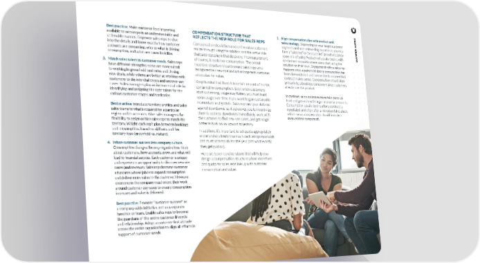 10 Best practice: Make customer-level reporting available to sales reps in an understandable and actionable manner. Empower sales reps to dive into the details and know exactly how customer accounts are consuming, who or what is driving consumption, and what use cases look like. 3. Match sales talent to customer needs. Sales reps have different strengths: some are more suited to working in greenfield territories and closing new deals, while others are better at working with customers to dig into challenges and uncover use cases. Sales managers play an instrumental role in identifying and assigning the right talent for the various customer stages and territories. Best practice: Introduce territory profiles and tailor sales teams to what’s required for a particular region and its accounts. Give sales managers the flexibility to assign or hire sales reps to match the territory. Weight each rep’s plan between bookings and consumption, based on skill sets and the territory type (greenfield vs. mature). 4. Infuse customer success into company culture. Consumption changes the way organizations think about customers, how accounts grow, and what will lead to financial success. Each customer is unique and represents an opportunity to discover new use cases (and revenue). Sales reps become customer advocates whose job is to expand consumption and deliver more value to the customer. However, everyone in the company must orient their work around customer use cases to ensure consumption increases and value is delivered. Best practice: Promote “customer success” as a company-wide initiative, not as a separate function or team. Enable sales reps to become the guardians of the entire customer lifecycle and relationship. Adopt a customer-first attitude across the entire organization to align all efforts in support of customer needs. COMPENSATION STRUCTURE THAT REFLECTS THE NEW ROLE FOR SALES REPS Compensation should be based on the value customers realize through using the solution and the active role that sales reps play in that discovery. The measurement, of course, is customer consumption. The overall incentive structure should reward sales reps who recognize their new role and act as long-term customer advocates for value. Keep in mind that there is a certain amount of inertia contained in consumption. Even when customers start out strong, usage may flatten; you must build upon usage over time if you want to gain sustainable momentum and growth. Sales reps are your defense against slowdowns, so it behooves you to incentivize them to address slowdowns immediately, work with the customer to find new use cases, and get usage patterns back on an upward trajectory. In addition, it’s important to set quota appropriately and articulate clearly how much each salesperson holds and must accomplish for the year (and what exactly they get paid on). Here are seven considerations that will help you design a compensation structure where incentives and quota for sales reps line up with customer consumption and value: 1. Align compensation plan with product and sales strategy. Depending on your target customer segments and user onboarding experience, you may have a “sales-led” or “product-led” growth model (or some mix of both). Product-led usually begins with on-demand accounts where users start using the solution on their own. Engagement with a sales rep happens once a pattern of strong consumption has been demonstrated and conversion to a committed contract makes sense. Compensation should align primarily to a bookings component since customers already use the product. In contrast, sales-led interactions take place up front and generally with larger enterprise prospects. Consumption usually begins after a contract is negotiated and often after a migration takes place, which means compensation should include a consumption component. CHAMPION GUIDES