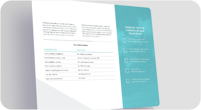 8 CHAMPION GUIDES Whatever value metric you select, don’t forget to ensure that it aligns with your delivery costs and will scale and grow with your customers. The only way to uncover this ideal provider-and-customer alignment is through testing. Yes, that means you should put your value metric out in the wild and see how it performs with real customers. Keep in mind that you’ll need to be patient—a data-driven approach requires implementing, testing, and iterating different ideas. It takes time and honing to ensure your value metric aligns with your underlying technology and resonates with your customers 8 CHECKLIST: TEST THE STRENGTH OF YOUR VALUE METRIC Does your value metric clearly communicate your solution’s value? Does it match how customers think and talk about your solution? Does it scale with customer usage and encourage more spend? Does it provide flexibility for customers? Does it align with your costs and support financial growth? Organization Type Value Metric Internet marketing platform # of marketing contacts Monitoring and analytics tools Amount of ingested or scanned GB Authentication services # of external active users Communication platform # of SMS messages Cloud computing service provider Per GB / domain Security network Per feature pricing Task automation service # of tasks Value Metric Examples