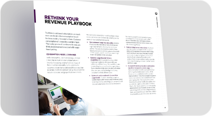 12 Traditional seat-based subscriptions are much more predictable than consumption-based business models. No surprise there. Customer consumption will always be a variable input. That’s why you need to reinvent the way you think about revenue to succeed with usage- based pricing. CONSUMPTION MODEL LEARNINGS With consumption, Financial Planning & Analysis (FP&A) teams must include multiple factors in revenue forecasting, ranging from the impact of factors such as seasonality, to the potential for customer onboarding to scale at a different rate than expected. And that’s not even taking into account the broader economic and geopolitical environments. Here are some consumption model learnings to heed so you can better plan for financial variability (and be aware of your potential blind spots): • New customers’ usage may vary wildly. Adoption of your solution depends on many technical and organizational factors that may be out of your control. The sales rep should be tracking these factors and working with the customer to smooth out this process, but it’s smart to assume a large degree of variation in the early days. • Customer usage does not follow a straight line. Every customer is unique, which means each customer will engage with your solution in a different way. This variability is seen in everything from ramp times to usage patterns. Even customers in the same industry with similar sizes, use cases, and technology stacks may consume in entirely different ways. • Systematic and unsystematic factors drive usage trends. It’s worth repeating: usage is a variable input, which means usage trends are going to be impacted by some things you can predict with data and some factors that are less foreseeable. You need to account for environmental changes, upcoming product improvements, and on-the- ground information about anticipated shifts in customer behavior that may not be evident in the data-driven usage history. • Contract sizing is an art, not a science. You should use historical data and insights to inform contract sizing, but it’s important to remember that this data is only one input. Solicit input from sales reps and sales leaders to adjust sizing based on the unique aspects of each customer. Depending on the product, front-end sales engineers will be especially instrumental in helping customers size their current and future usage. • Increased efficiencies and product optimizations may offset increases in customer usage. You have an obligation to continuously optimize your technology—customers expect no less. While it may sound counterintuitive at first, product improvements will likely have a negative impact on revenue as customers derive added benefit from your ongoing R&D. This may result in a short- term drop in customer credit consumption, even as customer usage stays the same or increases. Plan for this future variability and make ongoing adjustments to your forecasts. Be sure to keep your pricing metric and discounting practices in check, and ensure that your sales team is fluid in these benefits as part of the value-sale process. RETHINK YOUR REVENUE PLAYBOOK CHAMPION GUIDES