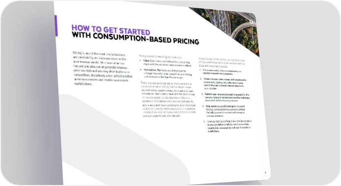 6 HOW TO GET STARTED WITH CONSUMPTION-BASED PRICING Pricing is one of the most crucial business and profitability decisions you make within your revenue model. Price a solution too low and you miss out on potential revenue; price too high and you may drive business to competitors. In contrast, a well-priced solution attracts customers and enables you to gain market share. Pricing equates to two things for customers: • Value: Customers must believe that your pricing aligns with the perceived value you aim to deliver. • Alternatives: The value you deliver must be stronger than what your competitors are offering and more attractive than the status quo. There is a huge potential upside when you move to consumption-based pricing, but that doesn’t mean the shift will be straightforward. An established SaaS provider will need a certain level of fortitude to change its revenue model and the downstream financial operations. Internal processes and systems must be able to accurately track consumption to bill individual customers correctly, which may require re-examining infrastructure. And, of course, none of this is possible without access to fast, accurate data. As you prepare for the shift to a consumption-based pricing model, focus on these five areas to minimize stress and help ensure success: 1. Pick a value metric that communicates your solution’s benefits for customers. 2. Modernize your sales process and compensation structure by aligning your sales team’s comp plan to the way customers derive value from your solution. 3. Rethink your revenue playbook to account for the variable nature of consumption and the challenges associated with forecasting revenue. 4. Help customers predict and optimize spend through consumption transparency, picking the right payment structure, and managing overage scenarios. 5. Leverage data by unifying it in a central repository so you can deliver a holistic view that provides insights into consumption and your financials on a daily basis. CHAMPION GUIDES
