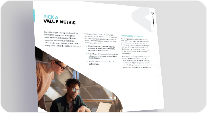 7 PICK A VALUE METRIC One of the biggest challenges is determining how to price your product. A well-priced solution benefits both SaaS providers and customers. It transforms providers into advocates for value, and value is about more than price—it’s about the success of customers. The purpose of a value metric is to communicate your product’s value to customers. It demonstrates an understanding as to why customers pay you for your service. Here are three factors to keep in mind when choosing your value metric: 1. It should be easy for customers to understand immediately. Your value metric should not be complicated or incomprehensible. 2. It should align with your solution’s perceived value and represent the value your customers believe the solution delivers. 3. It should scale and grow consistently with your customers’ use. HOW TO CHOOSE A VALUE METRIC Start by recognizing the challenges and use cases that customers are trying to solve when they select your solution. Today’s users are driving a value- based approach to buying solutions, so that’s a great place to begin. It’s where your value exists. Think about how your solution functions in order to solve a problem, and then consider the outcomes your customers track. Here’s another source of potential inspiration: Have any of your competitors adopted a usage-based pricing model? If so, look at what they picked as a value metric. It might be the right value metric for you, or it might spark ideas around value metrics that are even more appropriate for your target audience. CHAMPION GUIDES