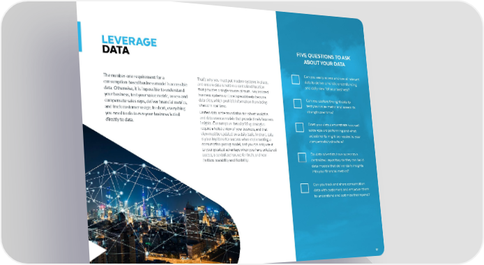 17 CHAMPION GUIDES 17 FIVE QUESTIONS TO ASK ABOUT YOUR DATA Can you easily access and use all relevant data to deliver a holistic understanding and daily view “of your business? Can you capture the right data to test your value metric and assess its strength over time? Does your data demonstrate how well sales reps are performing and what adjustments might be needed to your compensation structure? Do data scientists have access to a centralized repository so they can build data models that deliver daily insights into your financial metrics? Can you track and share consumption data with customers and empower them to understand and optimize their spend? The number-one requirement for a consumption-based business model is accessible data. Otherwise, it is impossible to understand your business, test your value metric, assess and compensate sales reps, deliver financial metrics, and track customer usage. In short, everything you need to do to run your business is tied directly to data. LEVERAGE DATA That’s why you must put modern systems in place, and ensure data is held in a centralized location that provides a single source of truth. Any isolated business systems or Excel spreadsheets become data silos, which prohibit information from being shared in real time. Unified data is the foundation for robust analytics and data science models that provide timely business insights. Consumption-based pricing strategies require a holistic view of your business, and that view must be updated on a daily basis. In short, data is your keystone for success when implementing a consumption pricing model, and you can only use it to your greatest advantage when you have unfettered access, a centralized source for truth, and near- limitless scalability and flexibility.